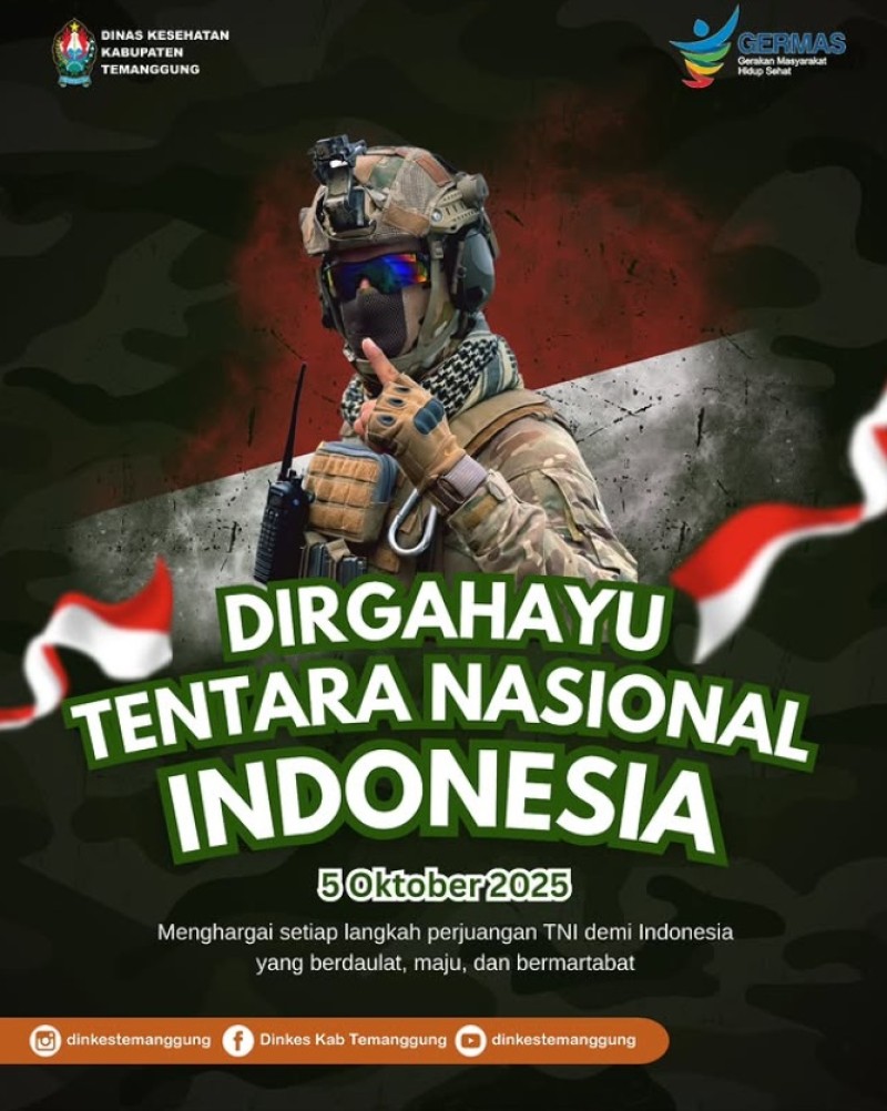 Dinas Kesehatan Kabupaten Temanggung menyampaikan selamat Dirgahayu Tentara Nasional Indonesia ke-79.